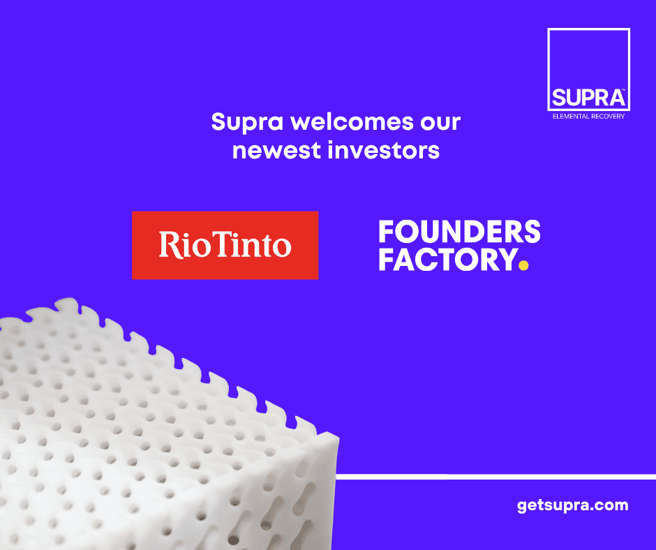 Rio Tinto and Founders Factory join Supra’s existing pre-seed investors, including Crucible Capital, Climate Capital, Portmanteau Ventures, and UT Seed Fund. The funding will support continued technology development and preparation for commercial pilots.